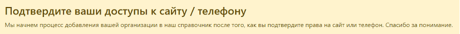 После заполнения информации необходимо подтвердить номер телефона, либо сайт. Без данной процедуры карточка не появится в справочнике.