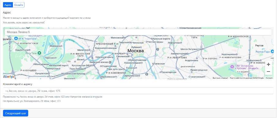 Выберите тип: онлайн или оффлайн. Укажите адрес и комментарий, если у компании отдельный вход. Так клиентам будет проще найти вас.