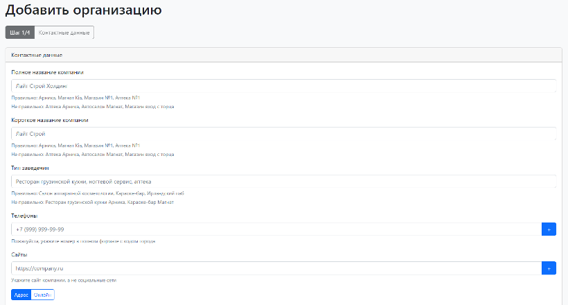 Заполните данные об организации. Логика заполнения похожа на Яндекс Карты: не указывайте в названии сферу деятельности, для этого есть отдельная строка.