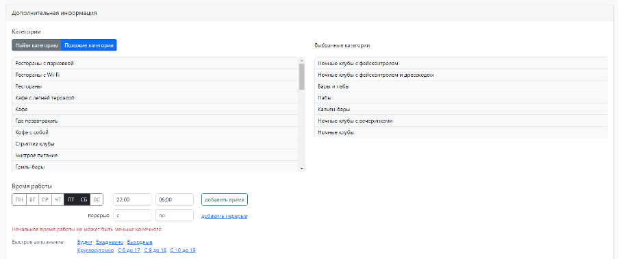 Укажите рубрики, по которым организация попадет в подборки справочника и клиенты смогут вас найти. Добавьте часы работы.