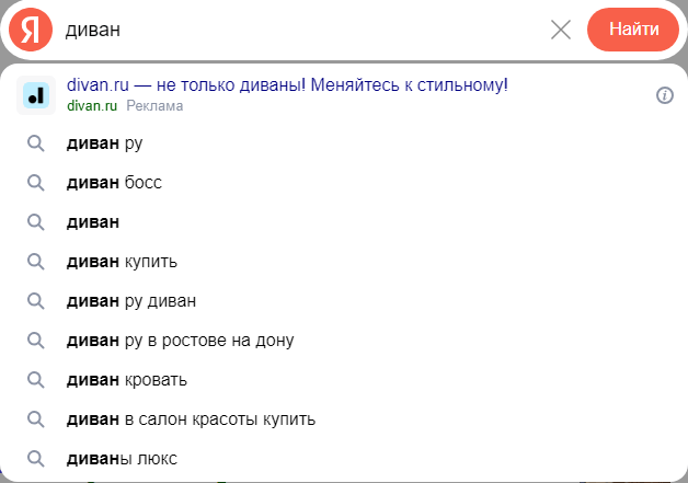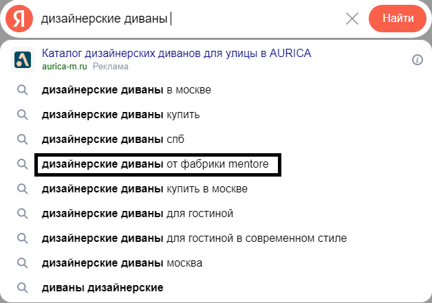 Гарантирует ли подсказка покупку? Нет. Клиент еще не созрел, без дополнительных усилий он сделает выбор в пользу привычного, а не нового. Возможно, дизайнерский диван ему вовсе не по карману. Но подсказка приведет клиента на сайт бренда, где у маркетолога будет шанс провести клиента дальше по воронке. Это постоянный и дешевый трафик заинтересованных пользователей.