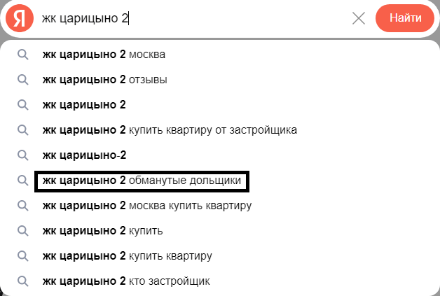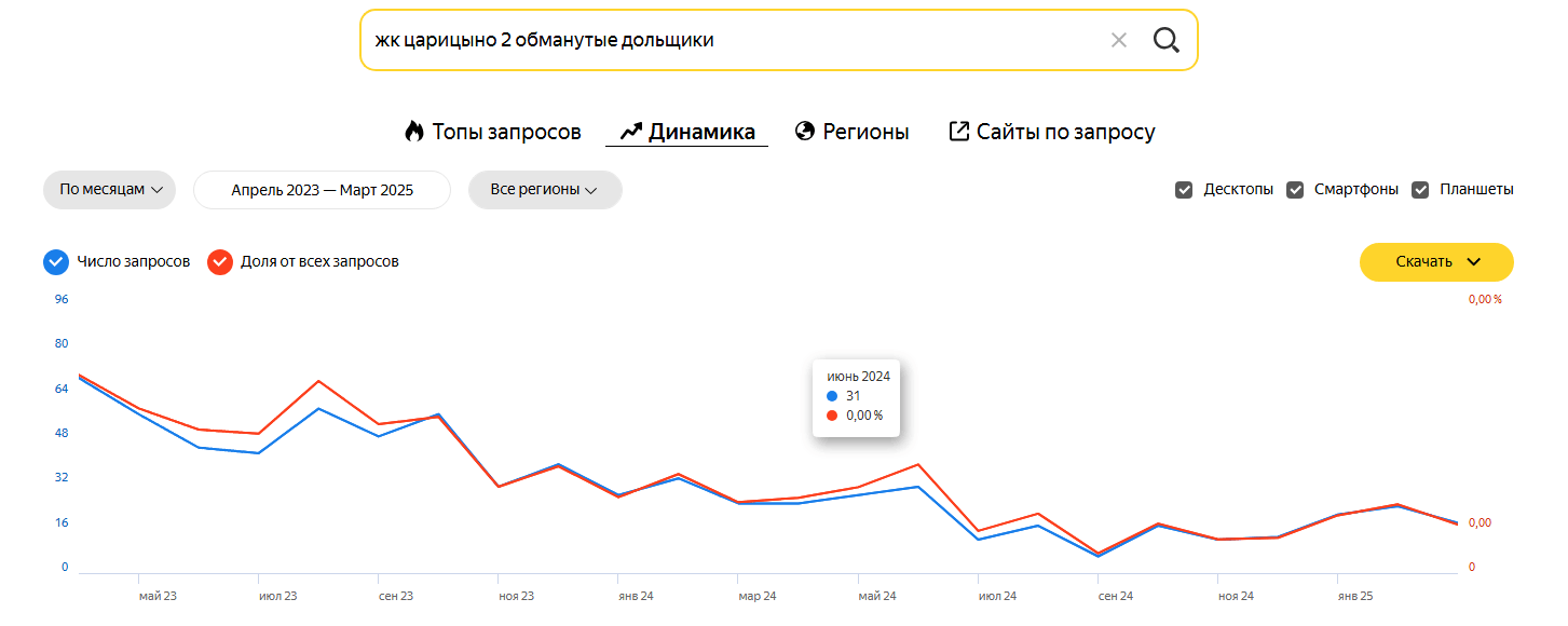 Компания теряет клиентов на этапе поискового запроса без шанса проработать возражения. Если не предпринимать мер, подобная подсказка останется висеть, даже когда интерес к теме иссякнет или компания решит проблему. Пример — на скриншоте: последний всплеск интереса к теме «жк царицыно 2 обманутые дольщики» был в июне 2024 года, но на момент апреля 2025 года подсказка все еще выпадает по ключевому запросу ЖК.