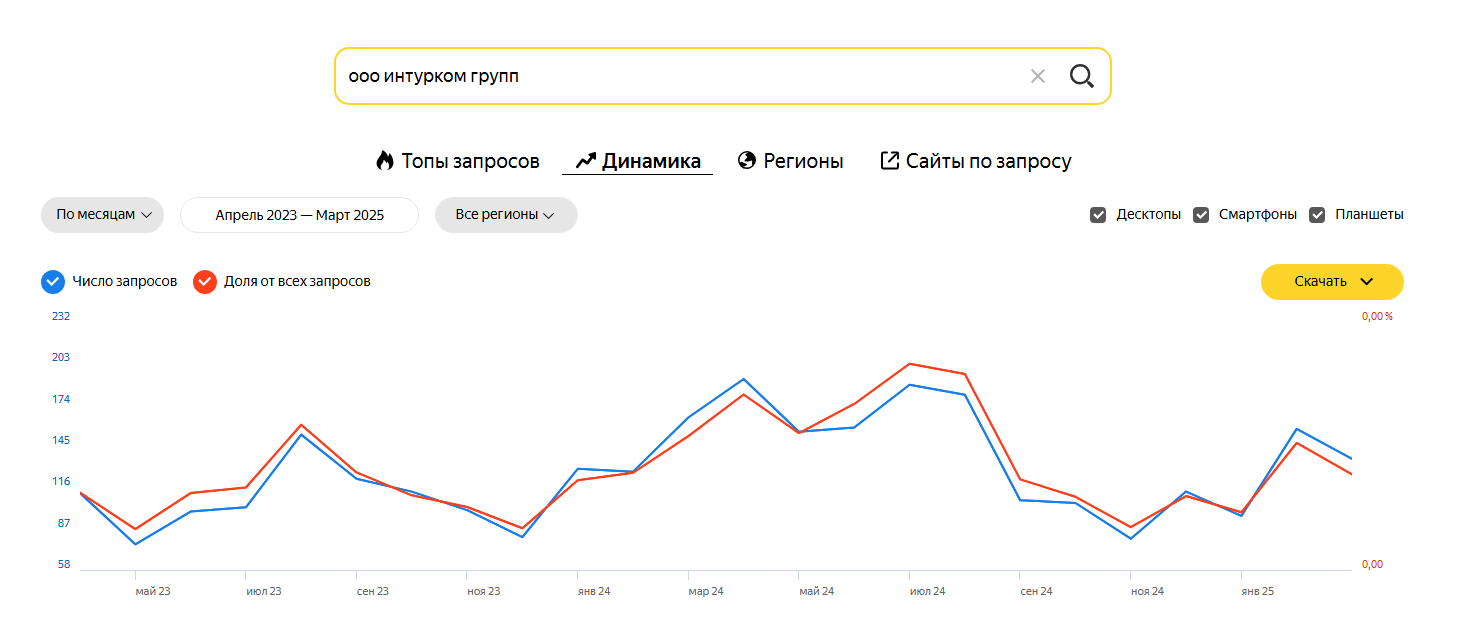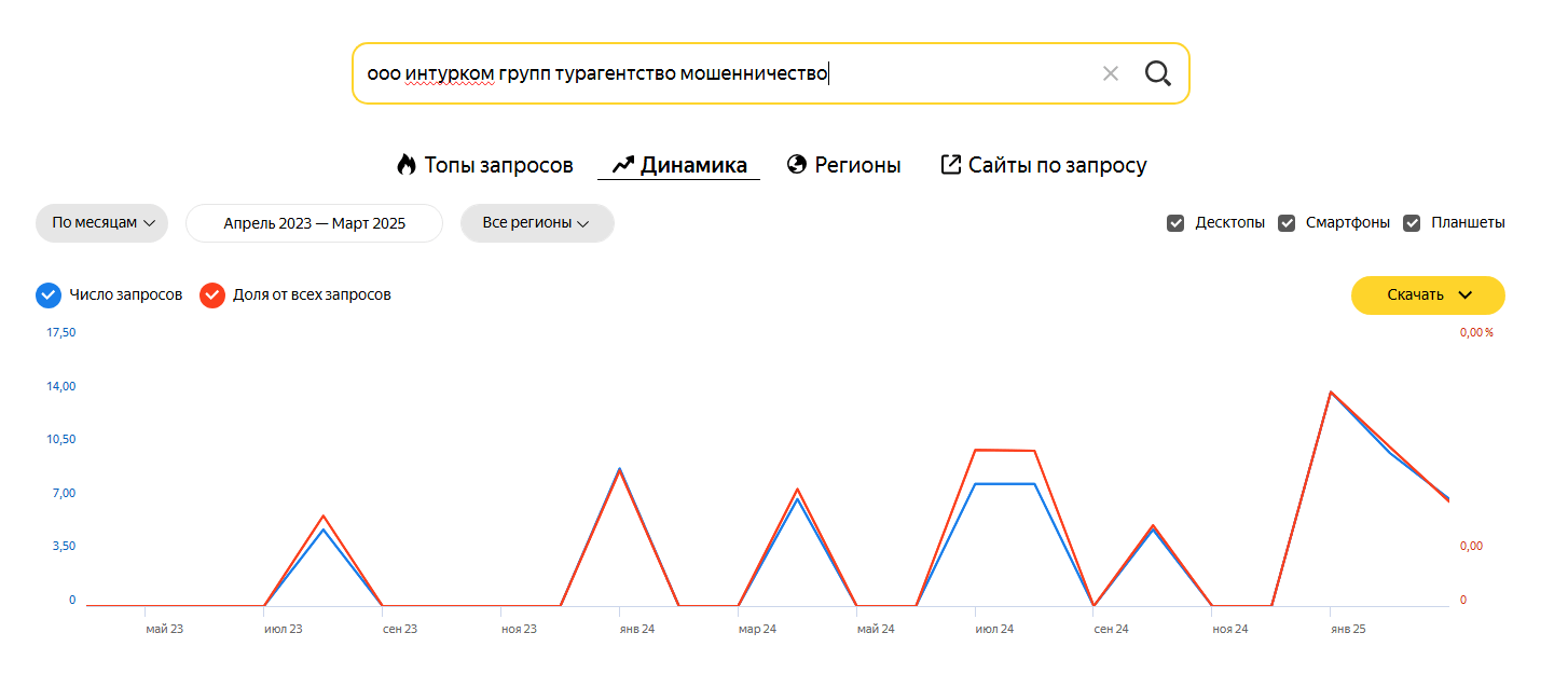 Поскольку подсказки зависят от интереса пользователей, необходимо проанализировать текущее количество и частоту запросов по теме. Берем брендовый запрос «ооо интурком групп» и негативную подсказку «ооо интурком групп турагентство мошенничество». Смотрим запросы в Wordstat. Нам важно количество запросов в месяц — степень интереса пользователей к теме.
