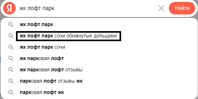 Теперь любой пользователь при попытки найти информацию о ЖК будет натыкаться на фразу про обман — красный флаг. Опасность подобных подсказок в безальтернативности: пользователь еще ничего не знает о ЖК, о конфликте, о ситуации в целом, но его доверие к компании уже снижено. Он не хочет рисковать.