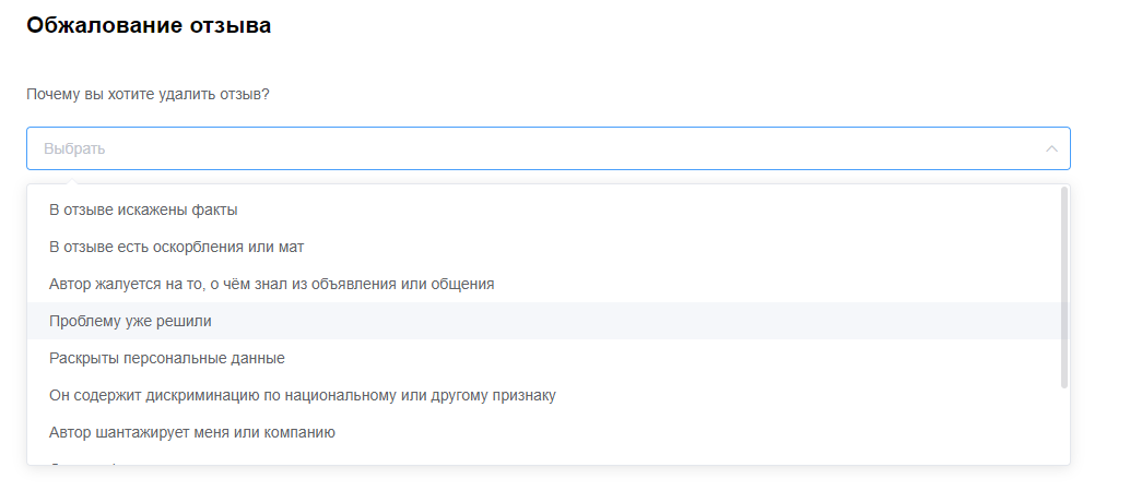 Выберите подходящую причину для удаления. Важно помнить, что не все причины жалоб являются основанием для удаления. Например, если клиент не верно указал этап сделки, отзыв не будет учитываться в рейтинге продавца, но его не удалят. Внимательно читайте правила Авито.