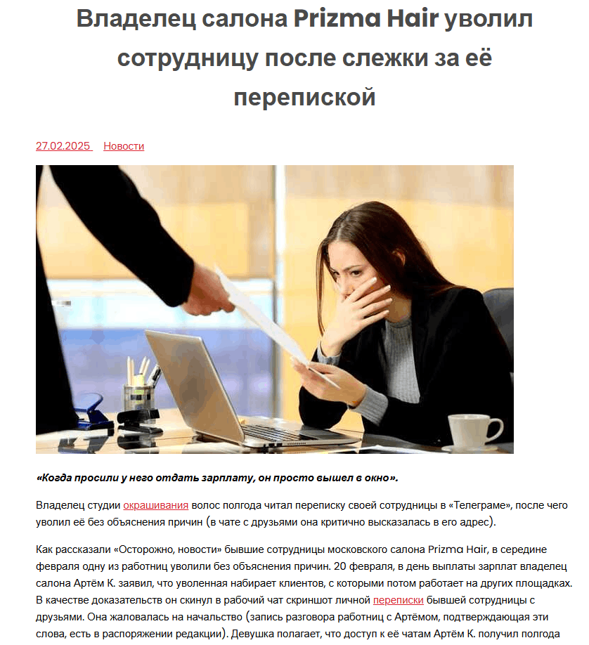 Показательный кейс 2025 года с салоном Prizma Hair. Сотрудница пожаловалась в сети на то, что владелец читал ее личную переписку, за содержание которой ее в итоге и уволили. Новость подхватили Телеграм-каналы на тему бьюти, затем крупные новостные. Итог — название бренда украсило полосы интернет-СМИ.