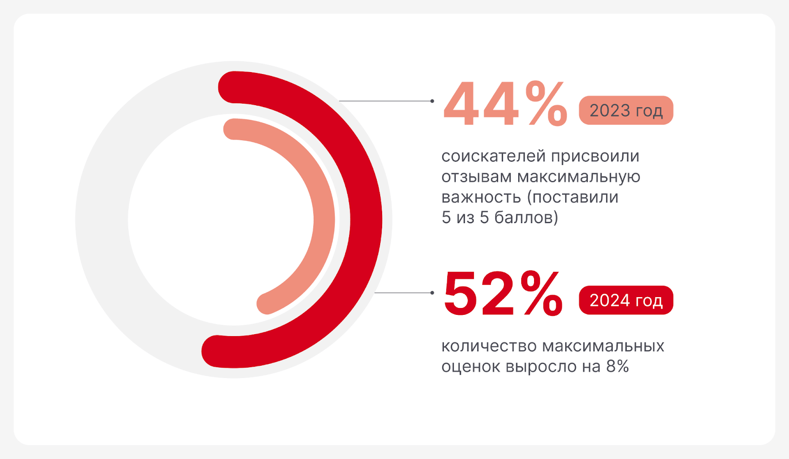 Согласно исследованию hh.ru за 2024 год, 95% соискателей читают отзывы о работодателях. Из них 61% читают отзывы о каждой компании, на вакансию которой планируют откликнуться. Отзывы служат не только фактором доверия, но и фактором сравнения компаний друг с другом.