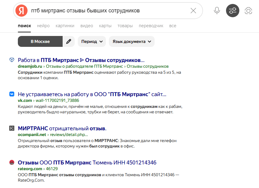 - Ситуативные «название компании + инфоповод», «название компании + ФИО руководителя». Подойдет, если с сотрудником расстались на повышенных тонах или вы точно знаете причину конфликта, которая с большой вероятностью всплывет в сети.