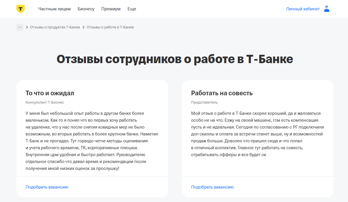 Интересный кейс у Т-банка — компания создала отдельный сайт для отзывов, который хорошо индексируется поиском и наполняет выдачу по ключевому запросу. Поскольку сайт принадлежит компании, все отзывы сперва попадают на внутреннюю модерацию. Таким образом Т-банк имеет подконтрольный ресурс, рейтинги на котором гарантированно не упадут ниже определенной планки.