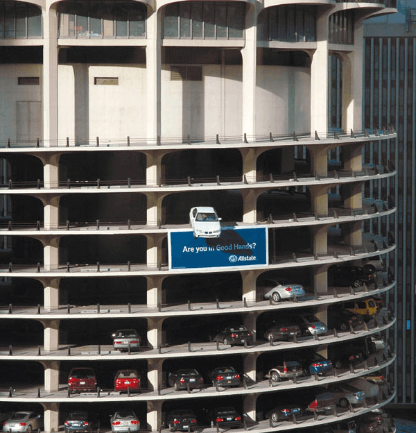 Вновь страховая компания. Allstate разместили на парковке в Чикаго висящий автомобиль и свой слоган: «Вы в надежных руках?».