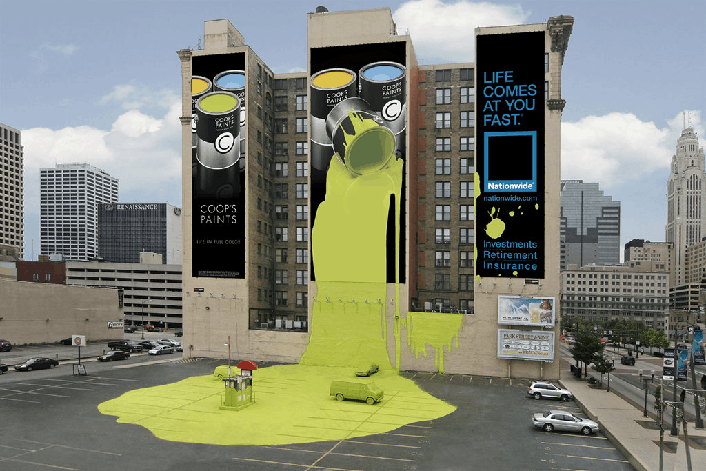 Разлитая краска от Nationwide напоминает о страховке, ведь с припаркованными машинами может случится всякое.