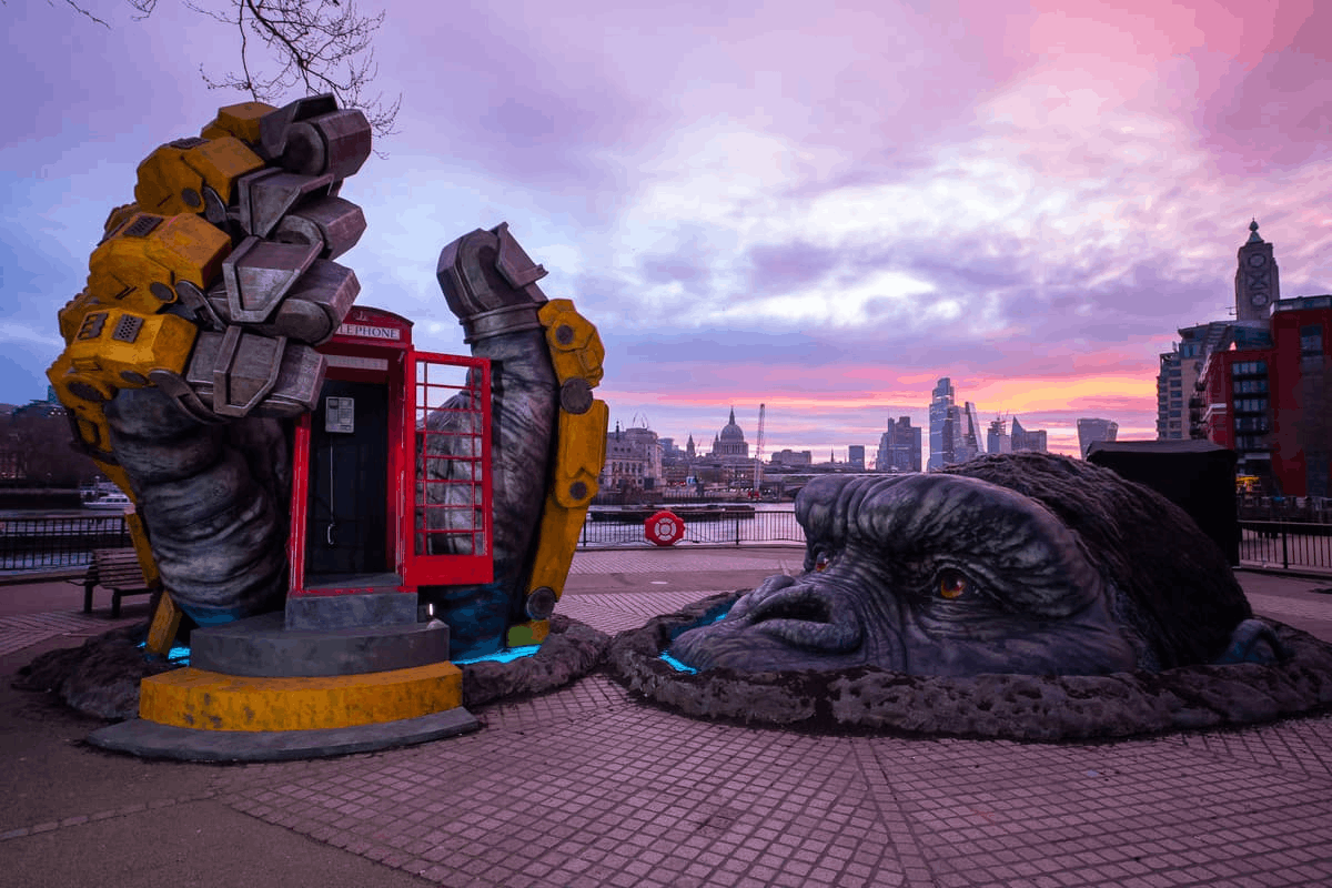 Инсталляция появилась в честь премьеры фильма «Годзилла x Конг: Новая Империя». Гигантской рука Конга сокрушает знаковую красную телефонную будку и горит 70 огнями, усиливающими эффект.
