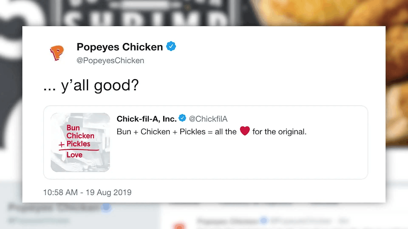 Бренд инициирует: сеть ресторанов Chick-Fil-A написали в Twitter (Х)*, что их сэндвич «оригинальный». Другая сеть, Popeyes, быстро ответили вопросом: «У вас все хорошо?». Разгорелась битва куриных сэндвичей, спровоцировав 23 млн упоминаний за 11 дней. На волне популярности запасы Popeyes смели за несколько недель.
