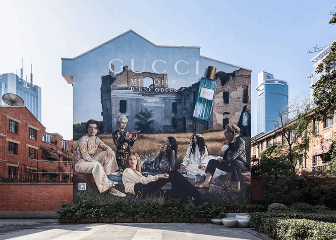 Арт-стена от Gucci, реклама парфюма Mémoire d’une Odeur. Бренд насчитывает десятки подобных стен.