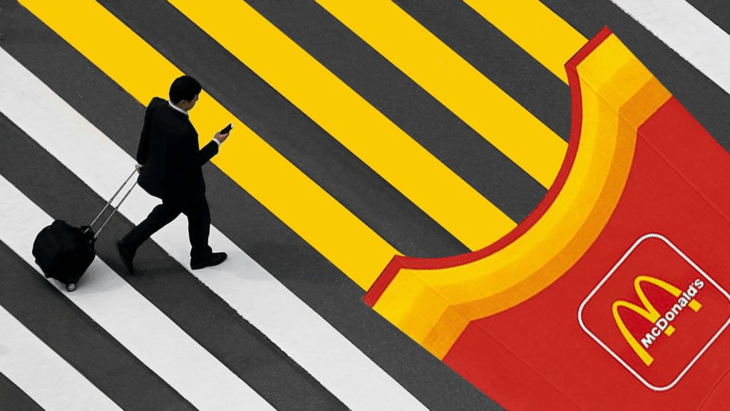 Использует городскую среду как площадку для творчества, создавая неожиданные «точки контакта». Потребитель видит бренд там, где его не должно быть: на поручнях, канализационных люках, пешеходных переходах, скамейках, фонарных столбах, крышах и в окнах жилых домов. Бытовые предметы превращаются в рекламные щиты и арт-объекты.