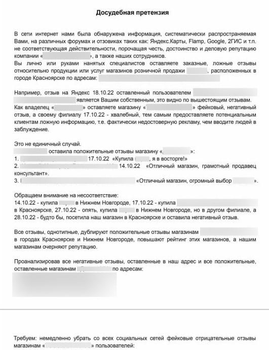 Вывод: иногда достаточно не самого действия, а демонстрации готовности действовать. Если вы точно уверены, что ваш бизнес топят конкуренты, знаете, какие именно отзывы фейковые и знаете, кто за ними стоит, можно направить конкурентам досудебную претензию. Понадобится грамотный юрист и свободное время. Как показывает практика, мало кто готов судится за несколько отзывов.