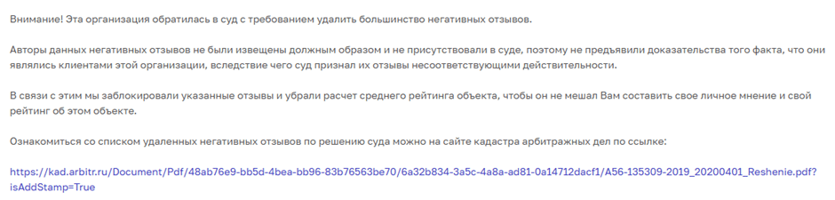 Компания столкнулась с наплывом негативных отзывов, что серьезно повлияло на репутацию и продажи. Поскольку отзывов было много, а связаться с авторами не представлялось возможным, компания обратилась в суд. На основании решения суда отзывы признали порочащими деловую репутацию на следующих площадках: Otzovik, orabote, Nahjob, Retwork, Ocompanii, jams, trn-news, turpravda, VK, Youtube, Zoon, neorabote, antijob, SPR, otzyvy.pro, irecommend.