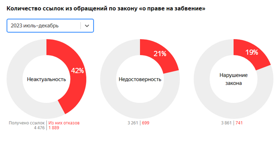 Закон обязывает поисковые системы скрывать URL-адреса на недостоверную, неактуальную, нарушающую закон информацию. Важно понимать, что речь идет не об удалении информации, а о сокрытии: пользователь не увидит ссылку в поисковой выдаче по ключевому запросу, но сможет перейти по прямой ссылке. Например, если ссылку разместили в соцсетях. Как показывает статистика Яндекс, в основном по Праву на забвение жалуются на неактуальную информацию.