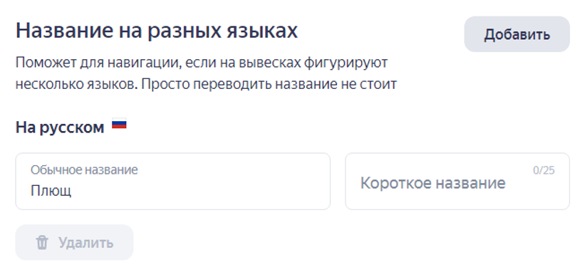 Далее — название компании на разных языках. Данный пункт стоит использовать, если у компании есть устоявшееся название в нескольких вариантах, то есть клиенты могут искать организацию на русском и на английском. В иных случаях пункт можно пропустить. Если компания имеет длинное название, например Московский государственный университет, добавьте короткое название — МГУ. Клиент сможет найти компанию и по запросу «МГУ», и по запросу «Московский государственный университет».