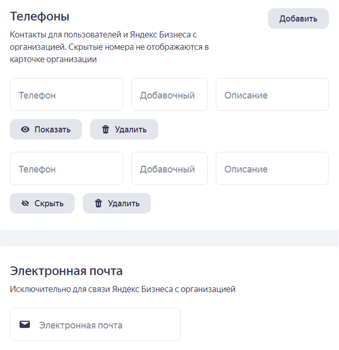 Далее необходимо указать телефон компании и электронную почту. По умолчанию в профиле отображается телефон, который вы указали при регистрации. По нему клиенты будут звонить в компанию. Вы можете указать другой телефон, настроить отображение номеров в профиле. К примеру, если у компании два рабочего номера.