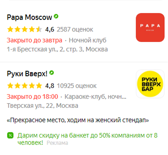 В нерабочие часы организация в картах будет отображаться как закрытая.
