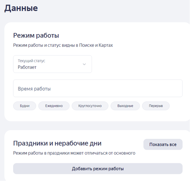 Первое — режим работы. Укажите актуальные часы и дни недели, измените данные в случае смены режима работы организации, чтобы клиенты видели актуальную информацию. Здесь же можно настроить режим работы для праздничных дней, либо режим по особому случаю. Например, если в ресторане отключили свет, в связи с чем сегодня заведение закроется на два часа раньше.