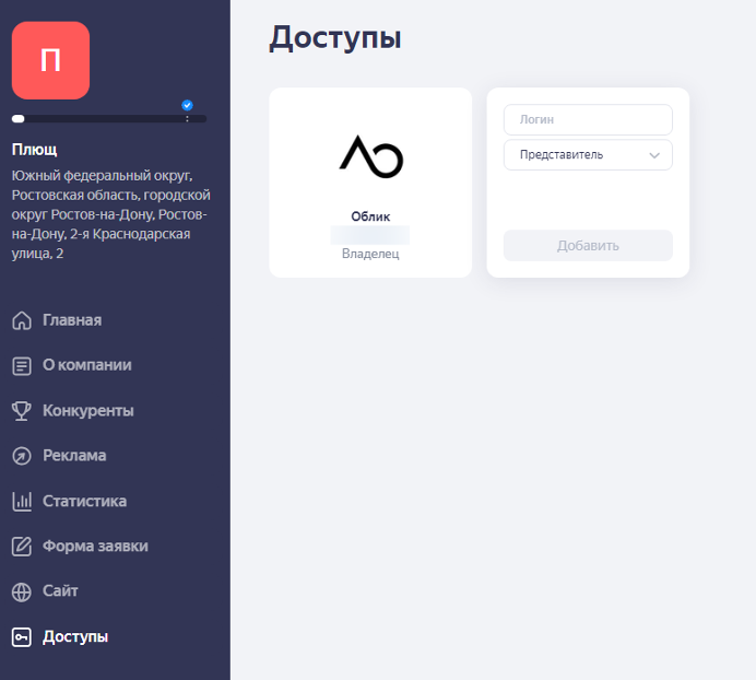 Если подтверждение прошло успешно, для управления откроются все блоки профиля. Теперь владелец может вносить изменения и передавать права через вкладку «Доступы». Чтобы присвоить статус официального представителя, достаточно добавить логин (почту Яндекс) того, кому вы хотите дать права. Вы также можете передать права владельца. Учтите, что владельцем всегда выступает один человек, тогда как статус представителя можно выдать нескольким пользователям.