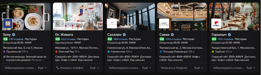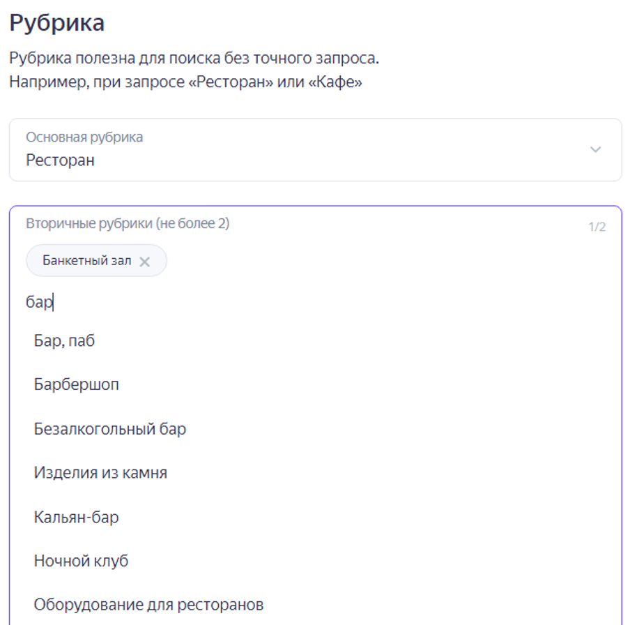 Рубрика — своеобразный фильтр компаний при поиске, поскольку пользователь может искать «кофейню», «кафе», «ресторан», «бар», желая найти место для ужина. Указывайте только те рубрики, которые соответствуют заведению. Например, если ресторан не проводит банкеты, не нужно указывать рубрику «банкетный зал». Иначе пользователь, который хочет арендовать зал для свадьбы, только разочаруется, а компания не получит клиента.