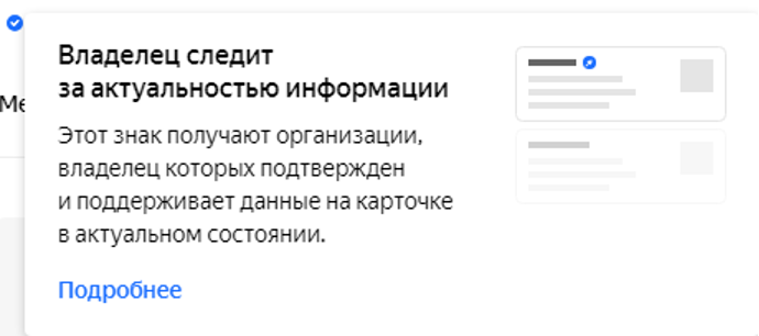 Организации с галочкой располагаются выше в карусели поисковой выдачи и вызывают доверие клиентов. Это важный показатель ранжирования, наряду с числом оценок, отзывов и рейтинга.