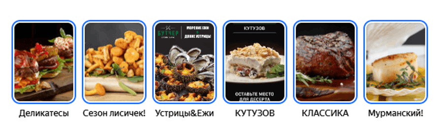 Истории располагаются над витриной (меню). Чем привлекательнее визуал в карточке, тем заметнее она для клиентов.