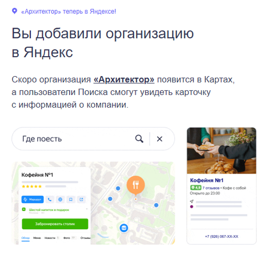 Базовая регистрация завершена — теперь ваша компания имеет профиль в Яндекс Бизнес и появится на карте после прохождения модерации.