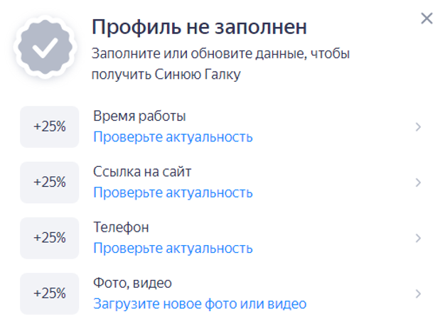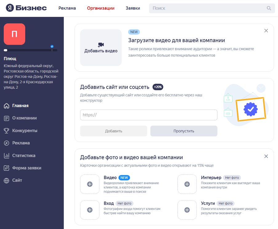 Когда профиль прошел модерацию, необходимо заполнить информацию о компании: добавить сайт, логотип компании, фотографии, режим работы, товары и другие данные. Чем больше информации, тем больше пользователей обратят внимание на компанию. Заполненность профиля влияет на получение синей галочки — верификации от Яндекса «Информация подтверждена компанией».