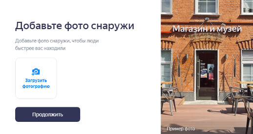 Добавьте фотографии организации снаружи: фасада здания, вывески, прилегающей территории. Так Яндекс сможет проверить, что данная организация действительно находится по указанному адресу.