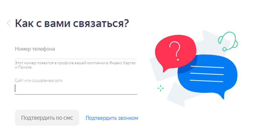 Укажите рабочий телефон компании и социальные сети. Номер необходимо будет подтвердить по СМС или через звонок. В дальнейшем номер можно будет заменить в профиле компании, либо добавить другие номера.