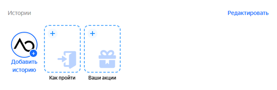 Истории добавляются через карты — редактировать блок. Здесь вы можете добавить видео или визуализацию «как пройти» для клиента, загрузить креативы акций, новости и другую информацию.