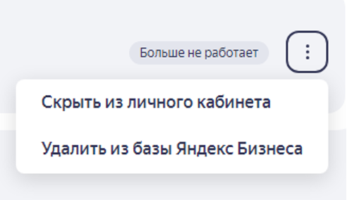 Также вы можете скрыть компанию из личного кабинета или удалить из базы Яндекс Бизнес: доступ к редактированию информации пропадет, карточка останется в статусе «больше не работает».