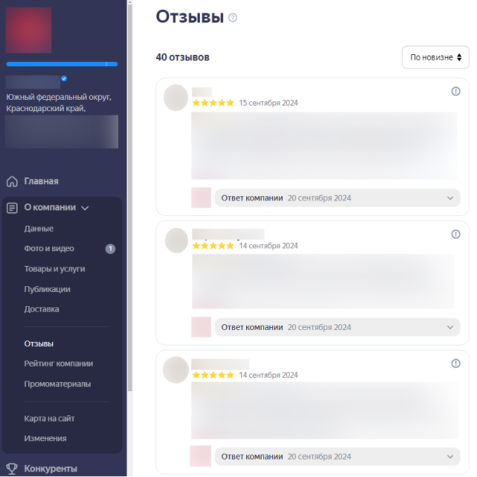 В правом верхнем углу есть кнопка сортировки: по новизне, сначала негативные, сначала позитивные. Чтобы ответить на отзыв достаточно кликнуть на поле ниже. Яндекс сам предложит заготовки для ответов.