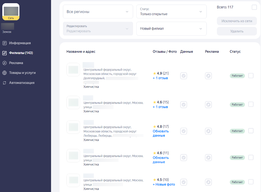 Второе — навигация. В сети проще отслеживать работу как отдельного филиала, так и сети в целом: статус, количество новых отзывов, корректные адреса и визуал, работу рекламных кампаний, подтверждение данных о компании.