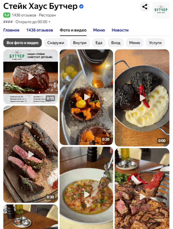 С базовыми настройками все, осталось добавить визуал — загрузить фото и видео. Чем больше фото, тем привлекательнее карточка компании выглядит в поиске. Яндекс рекомендует загружать минимум 5 фото и использовать теги: услуги, меню, интерьер и т.д.