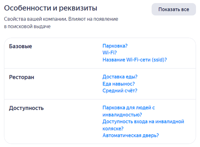 Особенности и реквизиты — уточнения по организации. Здесь можно отметить специфику компании и преимущества. Например, работу на вынос, возможность взять кофе с собой, доставку, опцию прийти с животным. Рубрики помогают пользователю найти нужное заведение, например, если человек хочется зайти в кафе с собакой или ищет только заведения с парковкой для инвалидов.