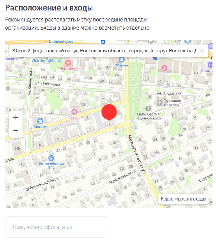 Расположение и входы. Старайтесь указывать расположение максимально точно: корпус, дом, строение, этаж и номер офиса. Особенно, если организация находится в офисном здании, где клиент может заблудиться. Если вход расположен с торца здания или во дворе, ставьте точку ближе ко входу, а не в центре здания.