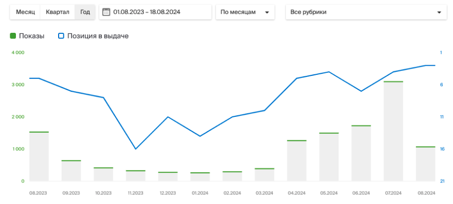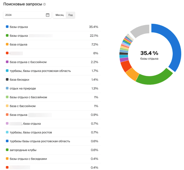 Синяя кривая — позиция в выдаче. В конце 2023 года база отдыха занимала 6-8 место, к августу 2024 года база вышла на 1-2 место, поддерживая высокие позиции и после летнего сезона.