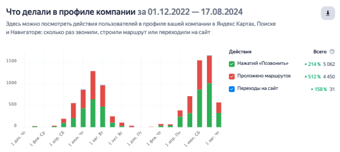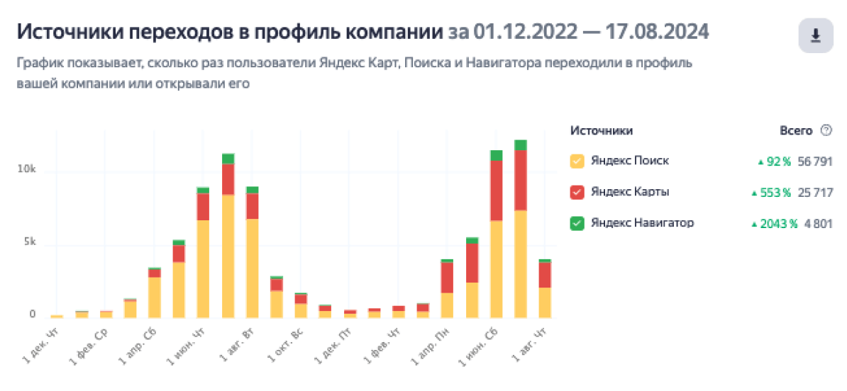 Количество переходов в профиль компании возросло, на скриншоте видно источники переходов и ярко прослеживается сезонность интереса. Если в 2023 году базу находили в основном через поиск, то в 2024 большую долю получили Яндекс Карты. Сыграло обновление визуала карточки и работа с отзывами: свежий позитив привлек внимание и повысил доверие к компании.