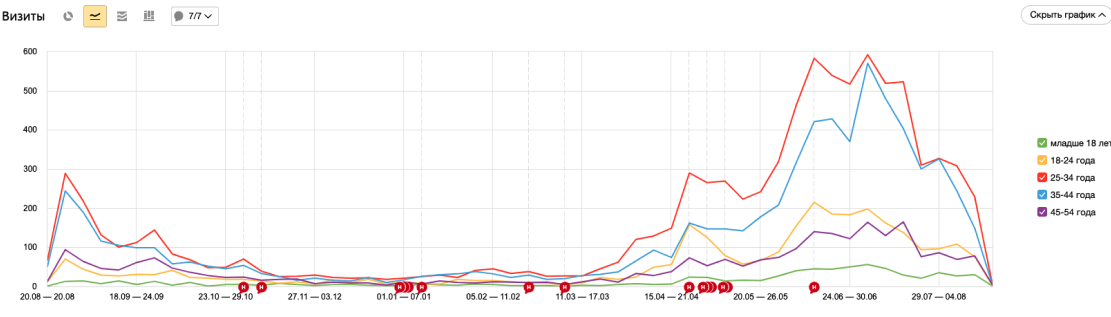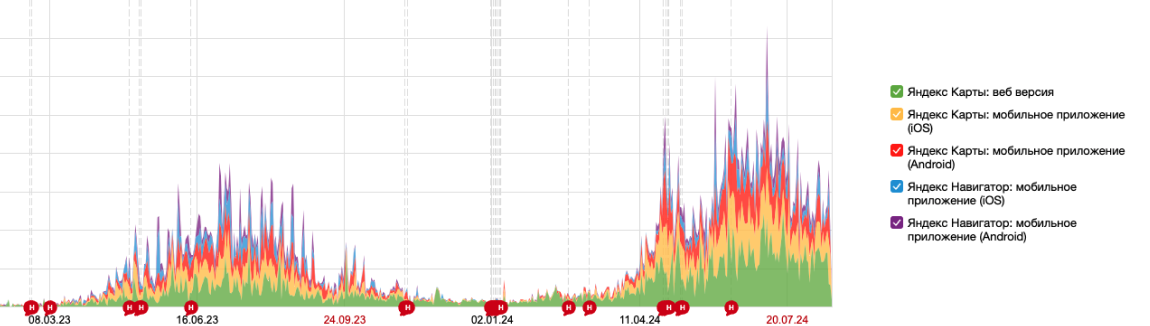 Благодаря метрикам Яндекс, удалось отследить изменения в цифрах и устройства, с которых клиенты просматривали информацию о компании: активность выросла как с мобильных устройств, так и с компьютеров. Показатели мобильного навигатора увеличились в два раза по сравнению с началом 2023 года и даже с пиком прошлогоднего сезона.