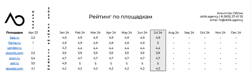 В рамках ORM мы собрали данные мониторинга упоминаний по всем платформам клиента: Google Maps, Яндекс Карты, Zoon, 2GIS и Otzovik. Анализ показал, что падение рейтингов затронуло в первую очередь 2GIS и Яндекс Карты, на геосервисы и было принято решение делать упор.