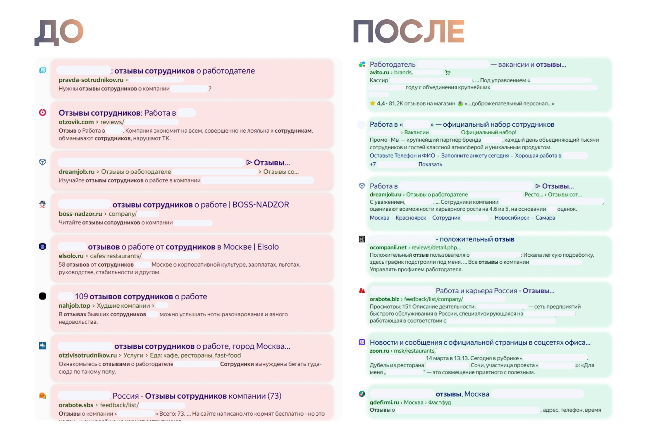Усилили репутацию работодателя в поиске — по запросу [название компании + отзывы сотрудников] соискатели видели только релевантные площадки и позитивные мнения.