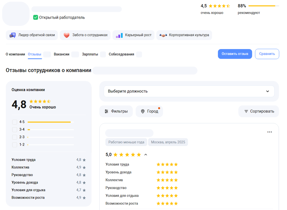 За период работы с февраля по июль 2025 года увеличили рейтинги на целевых job-сайтах с 3-3,5 звезд до 4,5-5.