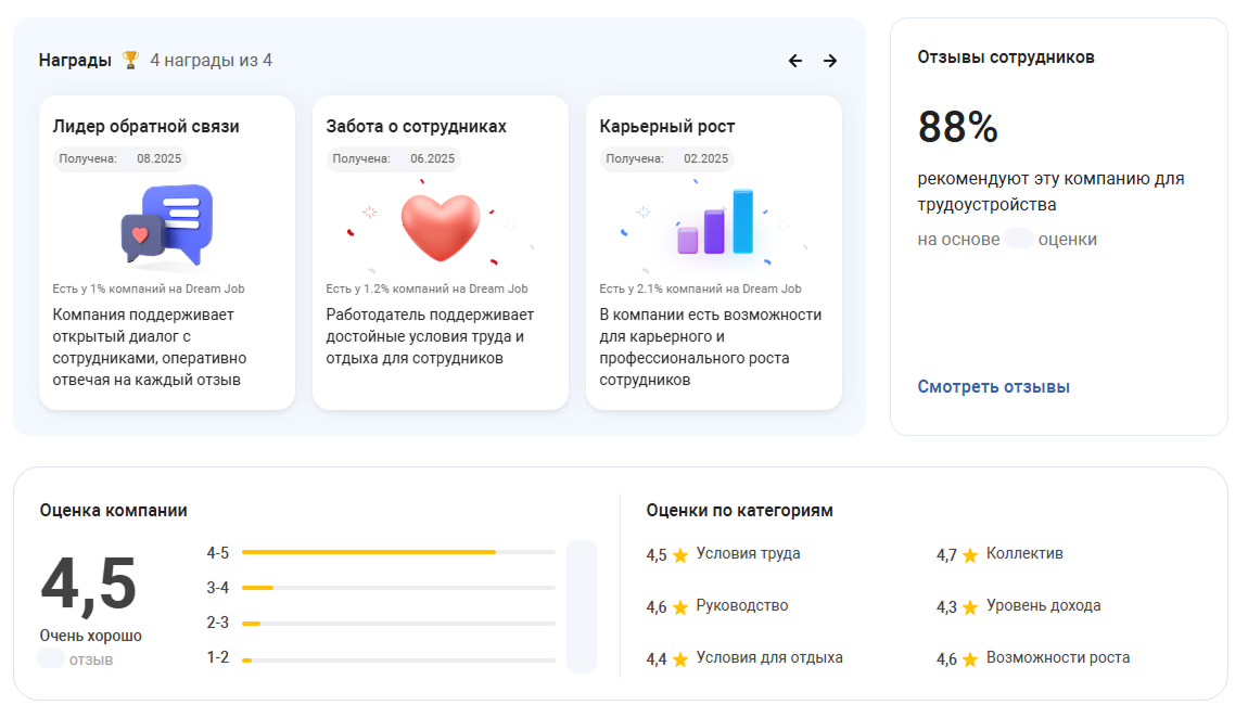 Dream Job является фактором доверия на первых этапах воронки: соискатели видят виджет с отзывами в вакансиях на hh, сайт в ТОП-3 поисковой выдачи. Рейтинги влияют на отклик и финальный выбор между работодателем «А» и «Б». Награды это не только результат притока новых отзывов, но своевременной обратной связи со стороны заказчика.
