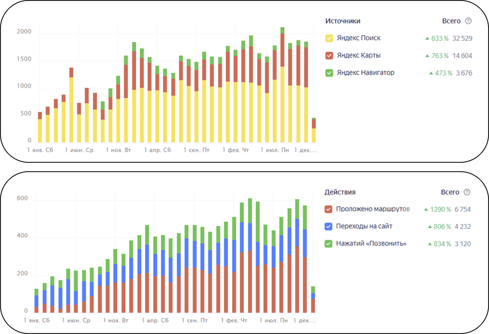 Статистика роста трафика клиники в Яндекс Картах за год.