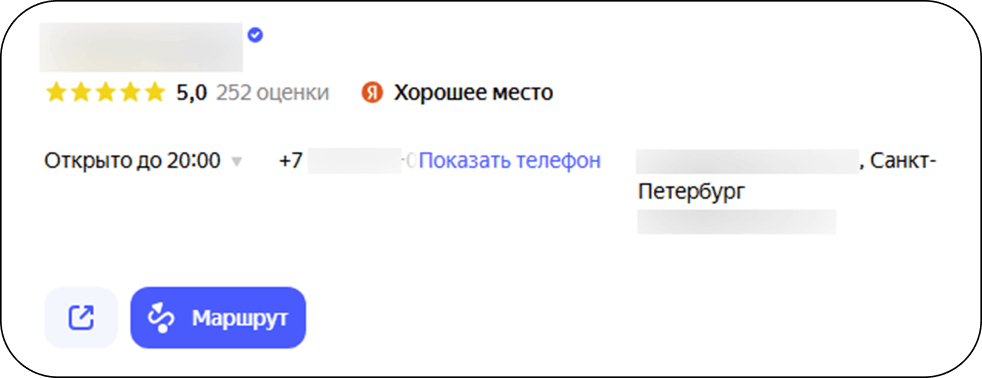 Наполнение поисковой выдачи: в ТОП-10 только целевые ресурсы с хорошим рейтингом и большим числом отзывов, все карточки компании заполнены.